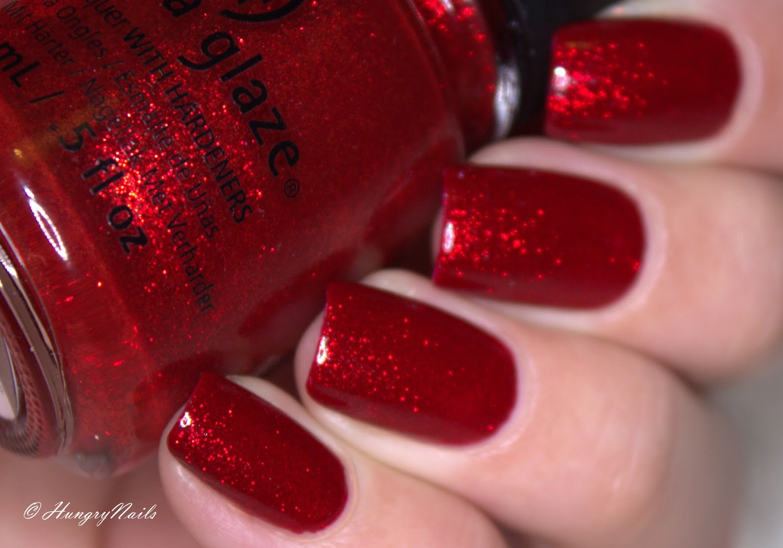 Der Lack, den ich ausgesucht habe, ist der China Glaze Ruby Pumps. Für mich ist das einfach einer der schönsten Rottöne, die es bislang in Nagellackflaschen gab. Knallig, glitzernd, elegant, auffällig, vampy, Ruby Pumps hat alles, was sich das Nagellackherz wünscht. Für einige ist er sicher das perfekte Rot zu Weihnachten - für mich passt er einfach immer, wenn mir nach Rot ist.